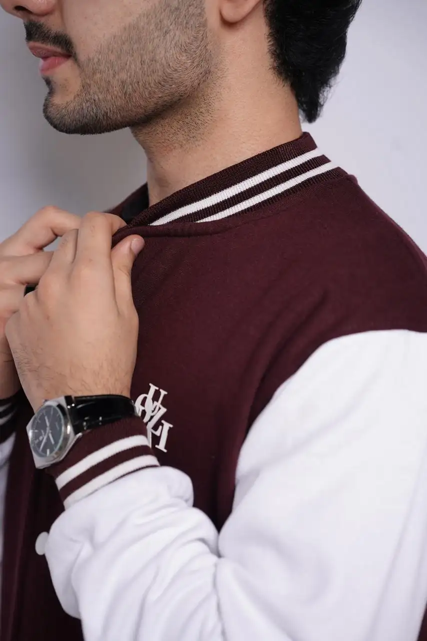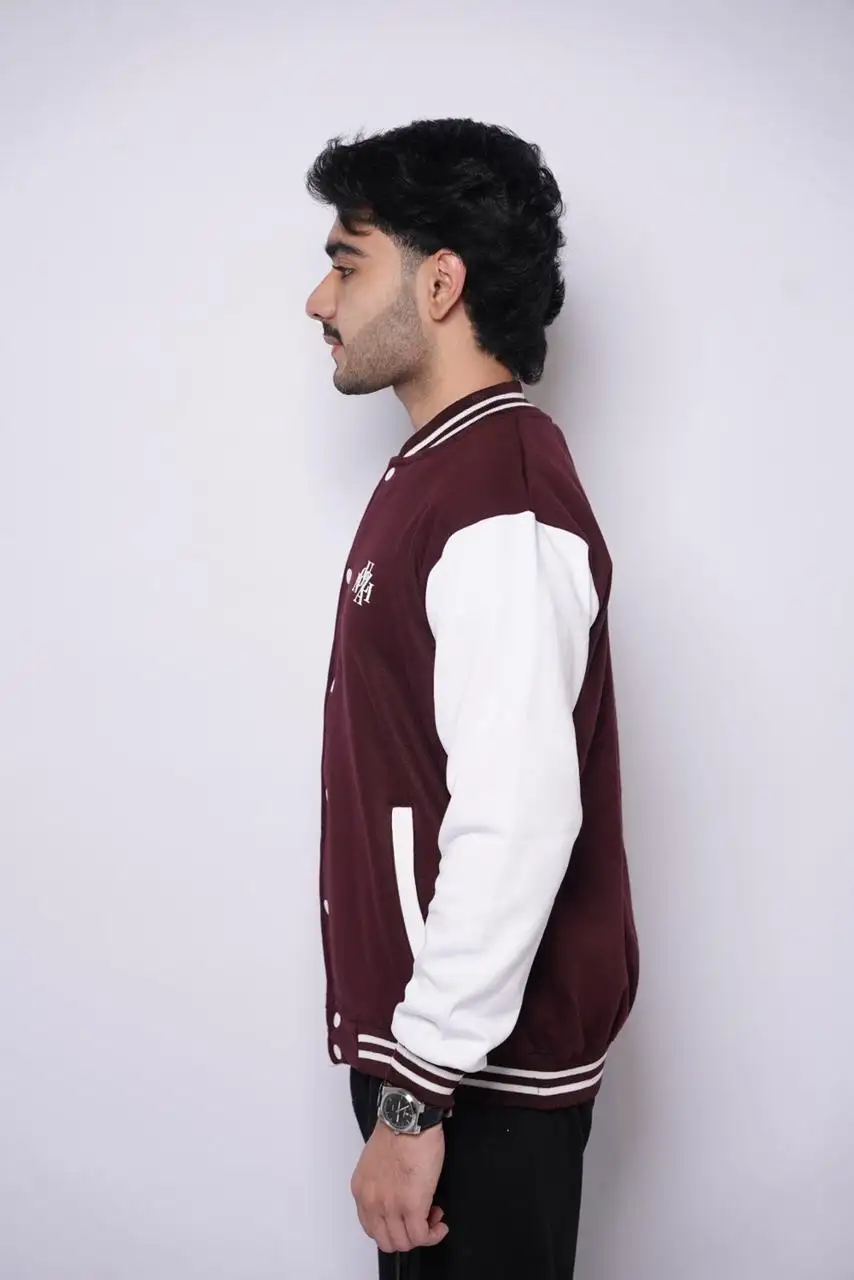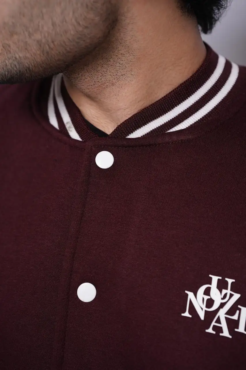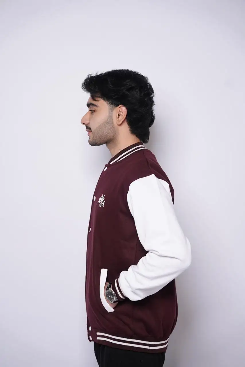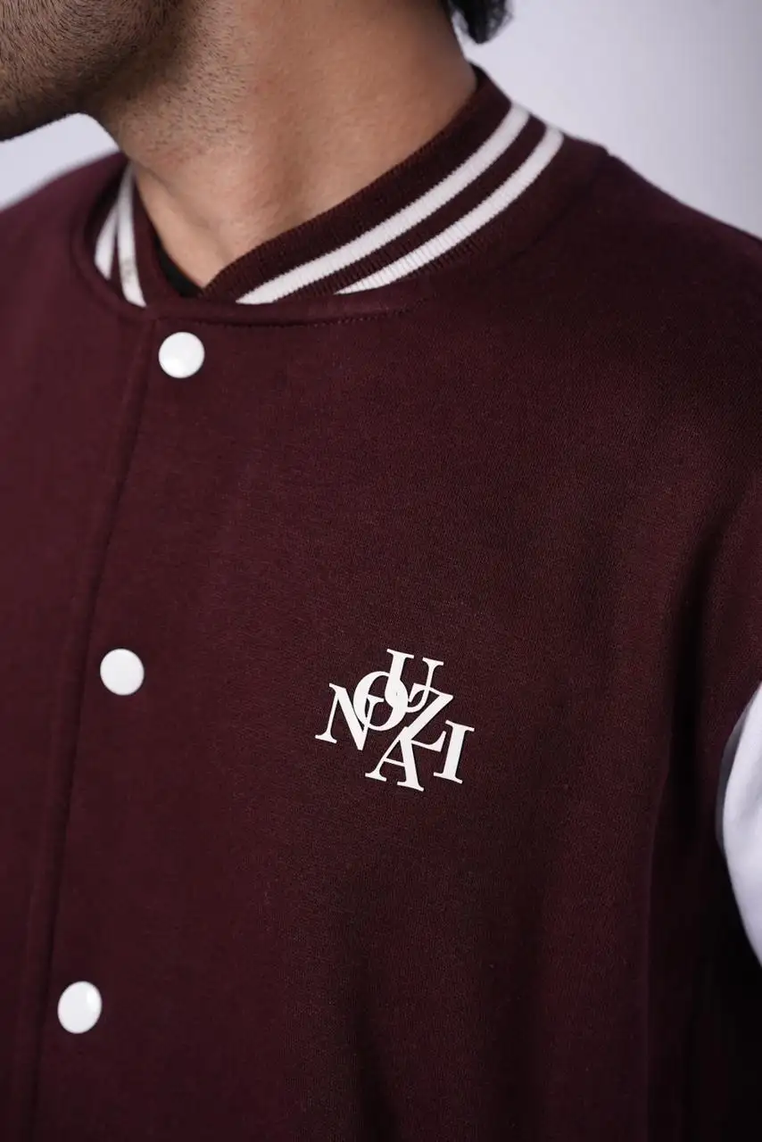 Make a statement with our Maroon Varsity Jacket, designed for those who love timeless streetwear with a modern twist. Made from high-quality wool-blend fabric with a smooth finish and soft inner lining, it keeps you warm and stylish all day. The rich maroon color, striped ribbed trims, and front snap-button closure give it that iconic varsity look, while the minimal embroidered logo on the chest adds a touch of sophistication.
