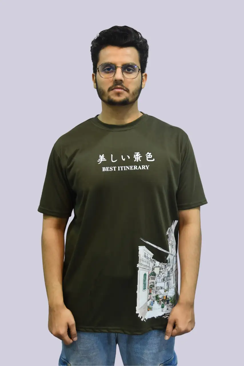 The premium olive green tone delivers a refined yet trendy feel, making it easy to pair with jeans, cargos, or shorts. Whether you’re heading out for a casual meetup, a city walk, or your next travel adventure, this t-shirt ensures you stand out effortlessly.